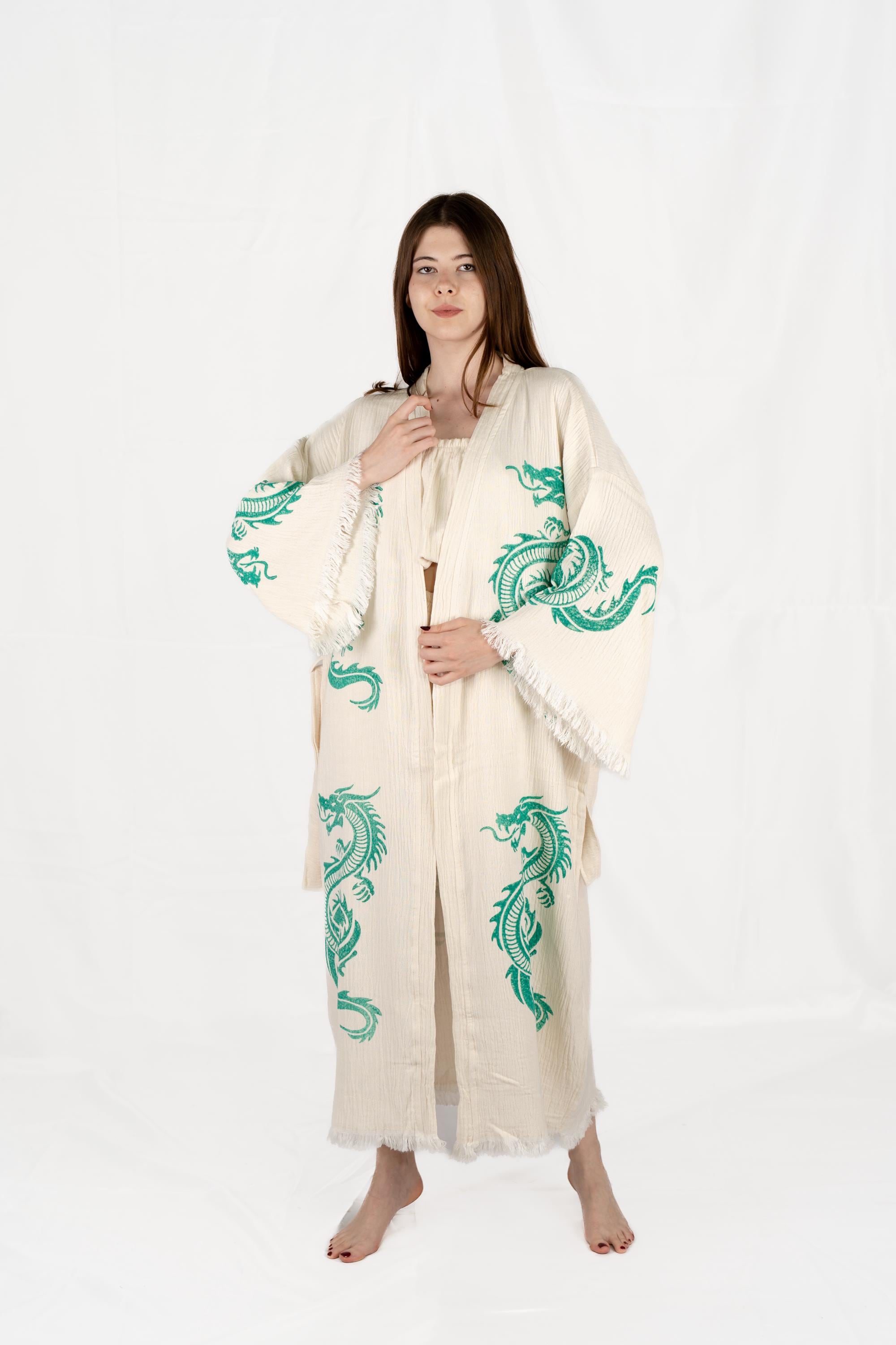 White and Green Dragon Print Robe, Animal Print Clothing, Beach Coverup, Unique Kimono, Dragon Print Bathrobe, Gift For Women and Men