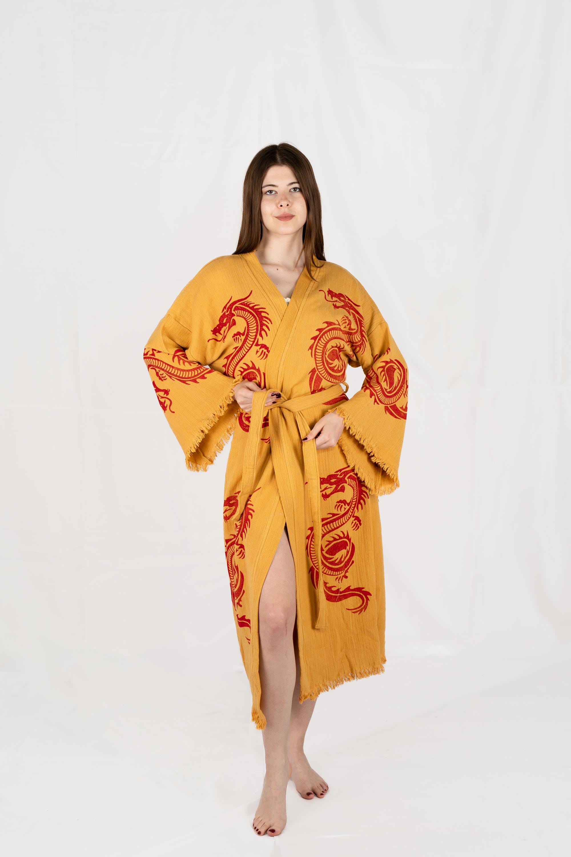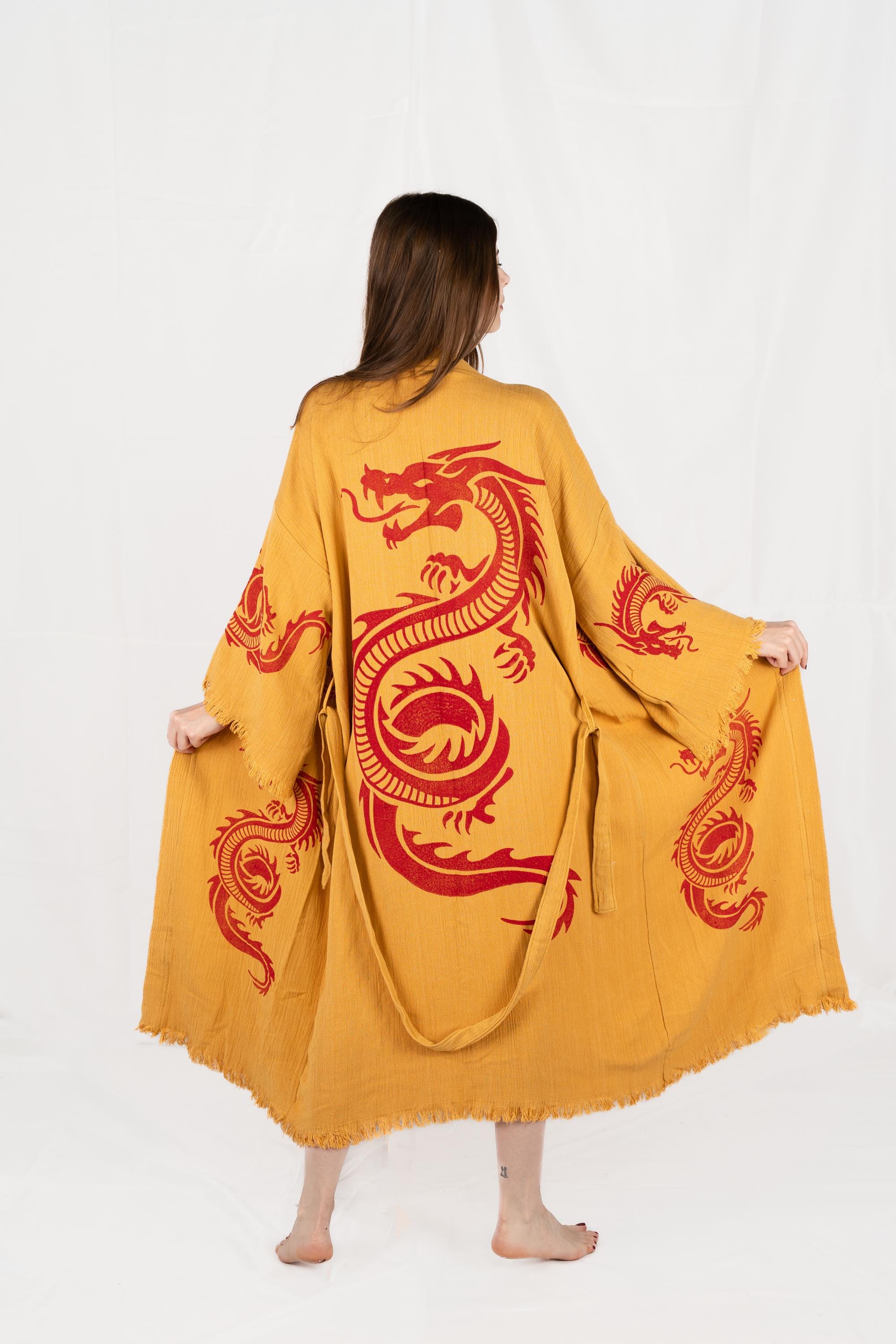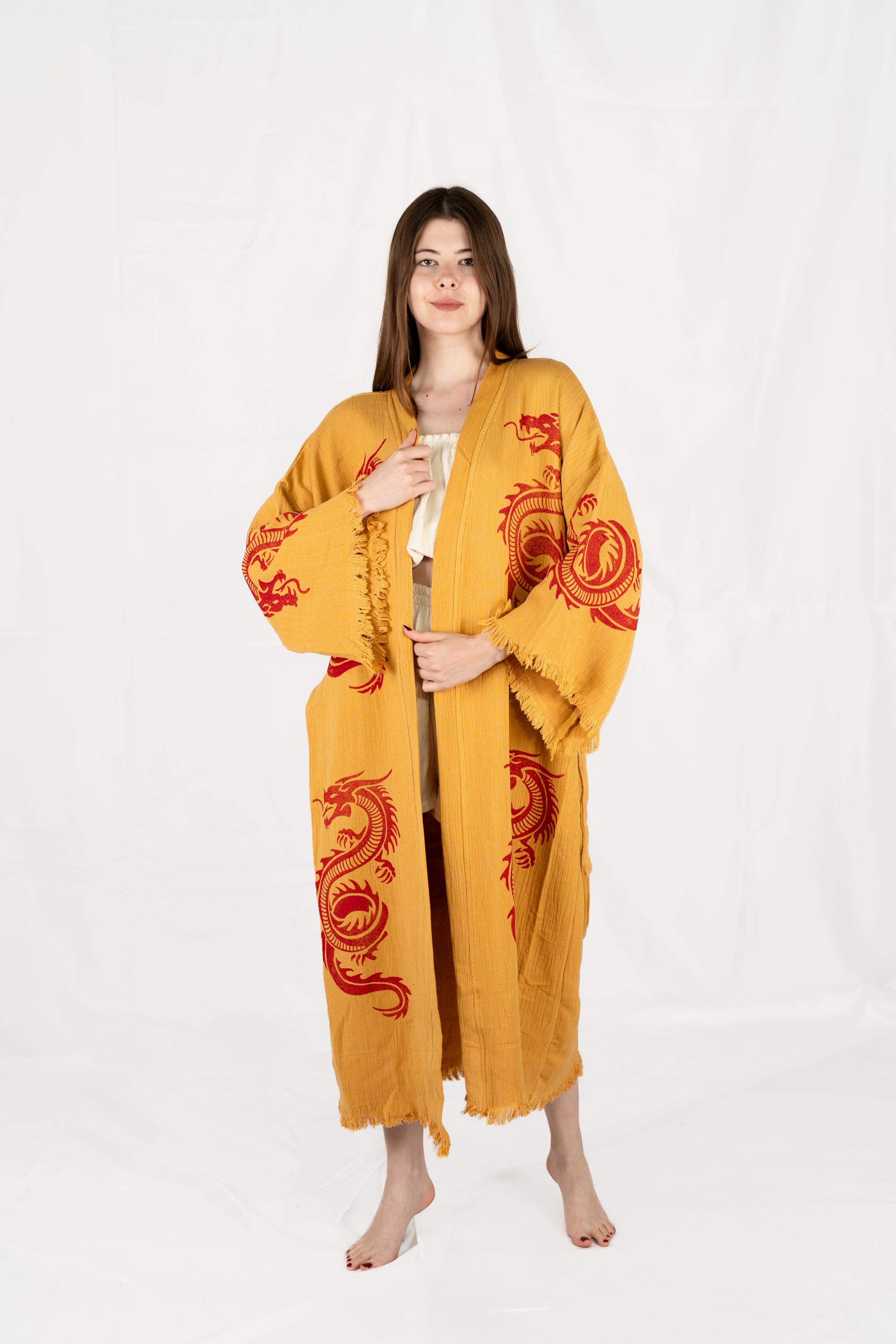Yellow and Red Dragon Print Robe, Animal Print Clothing, Beach Coverup, Unique Kimono, Dragon Print Bathrobe, Gift For Women and Men