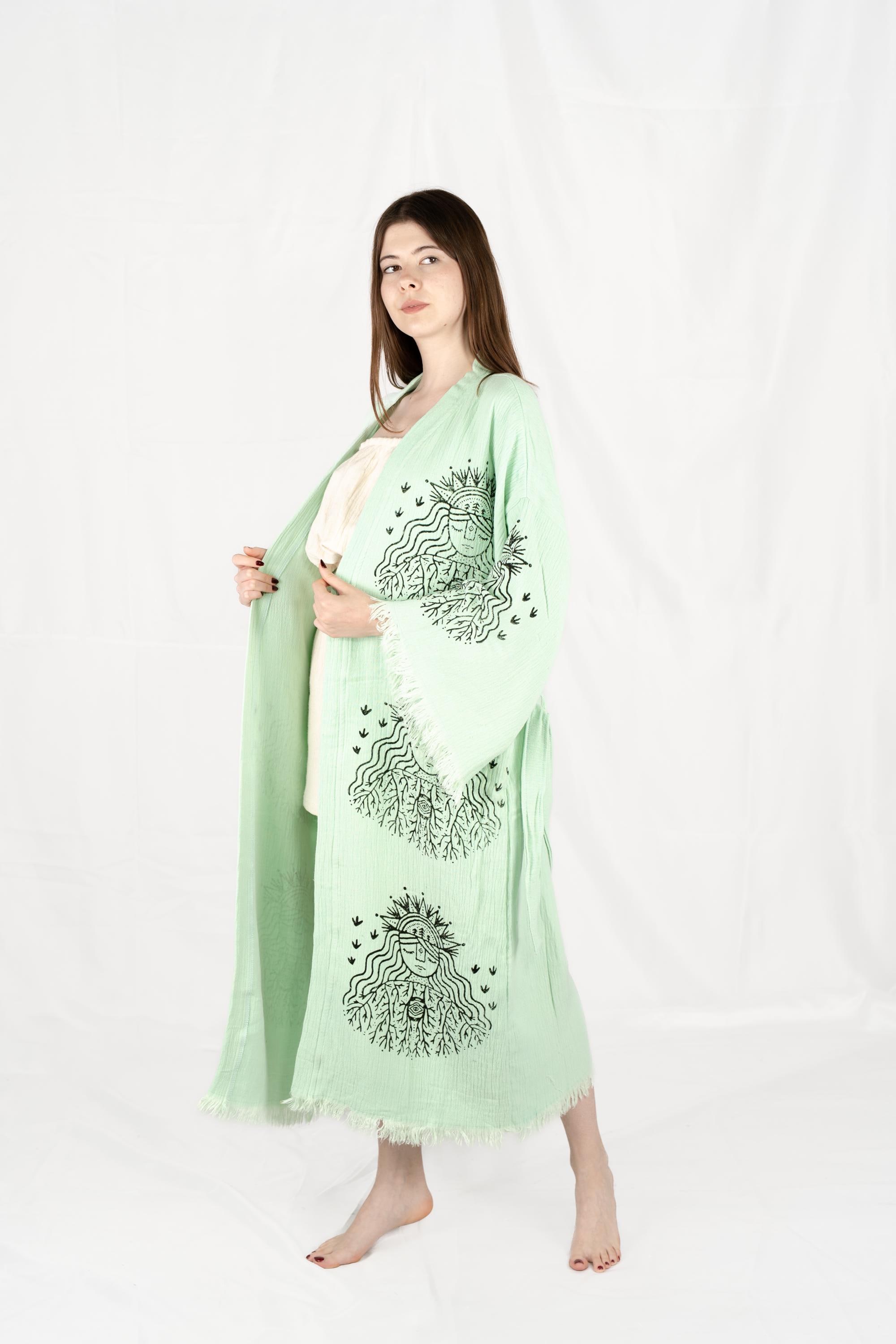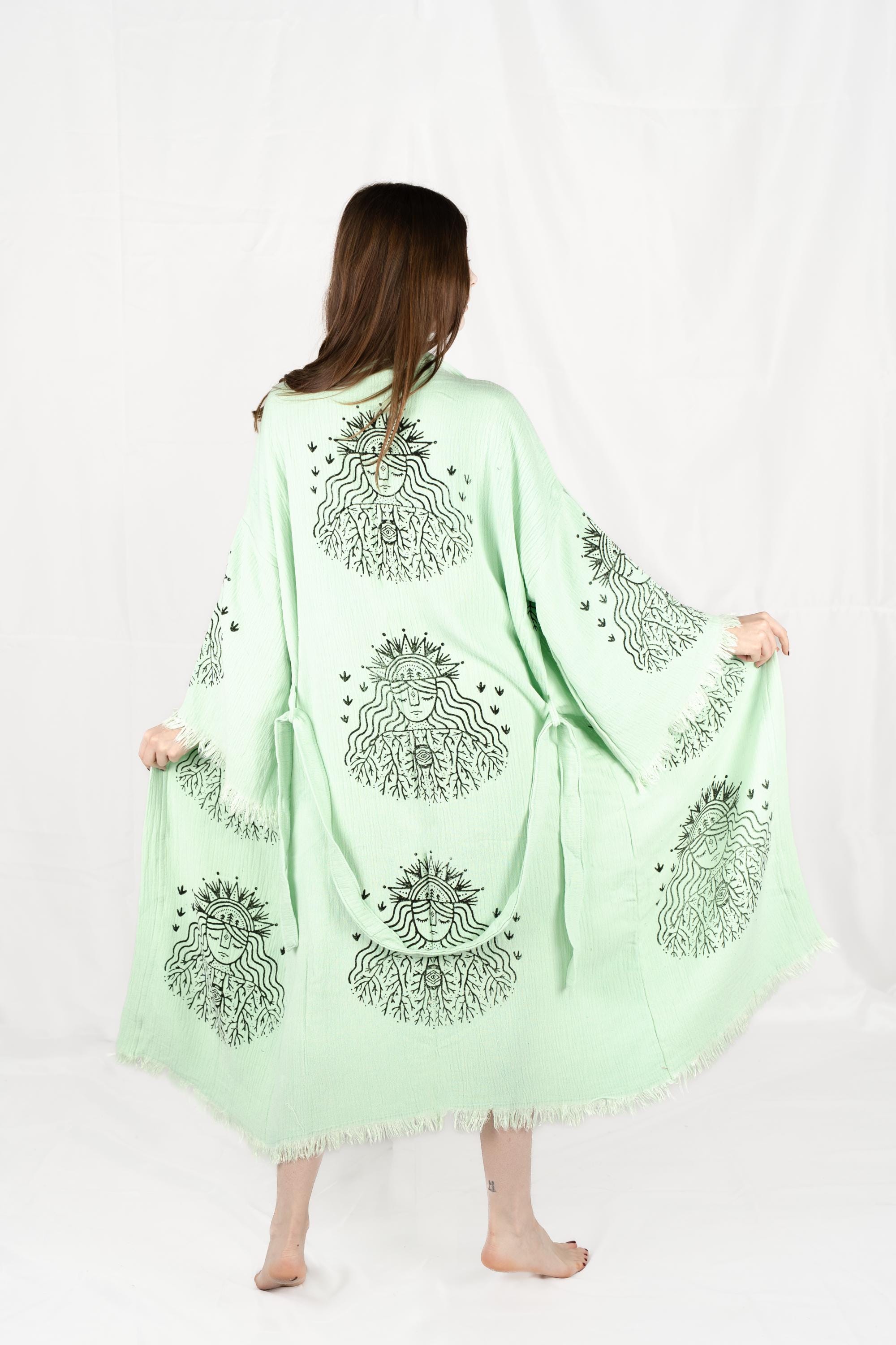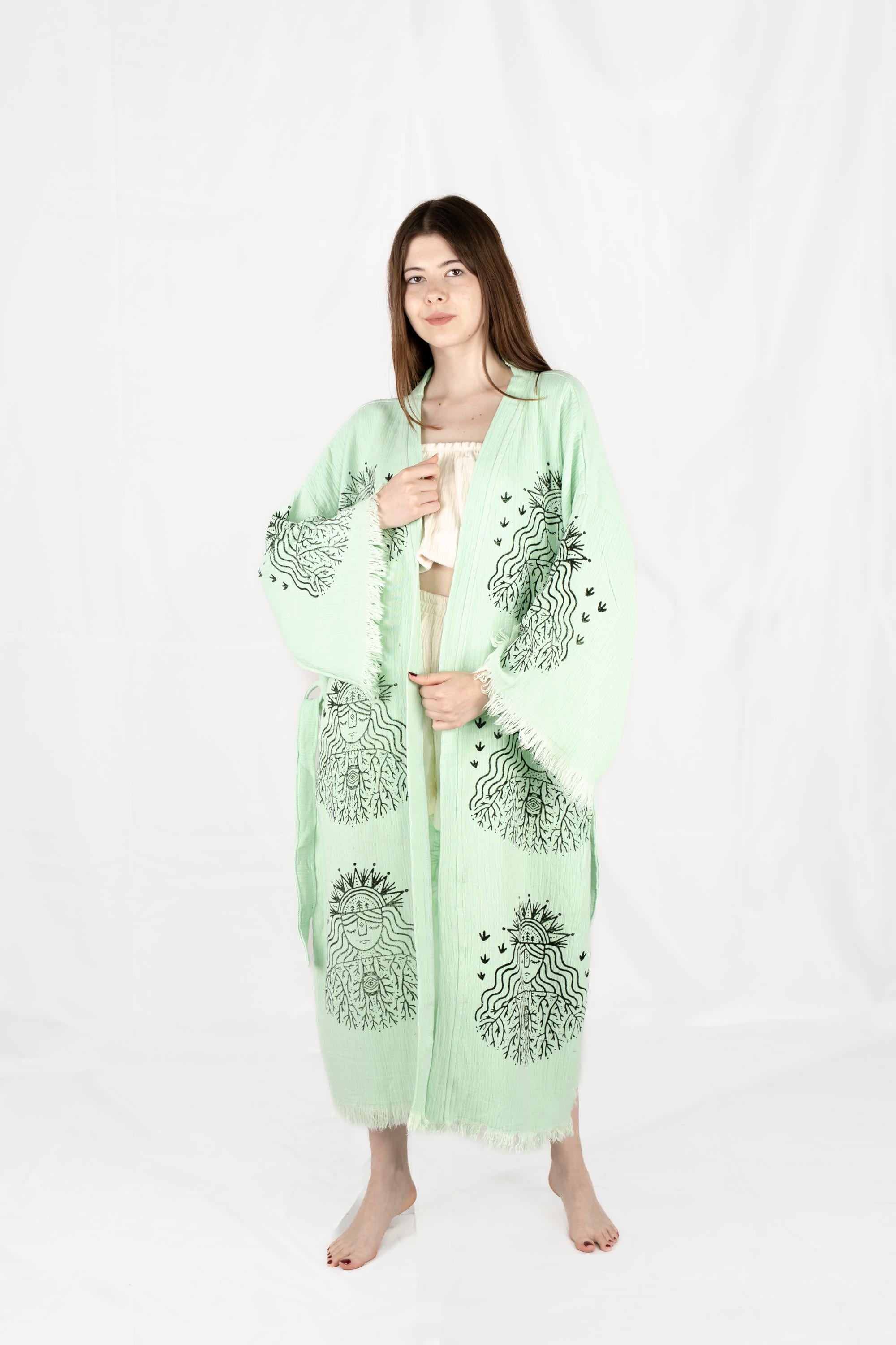 Mint Green Turkish Organic Cotton Primitive Face Pattern Muslin Kimono Robe, Gift For Her