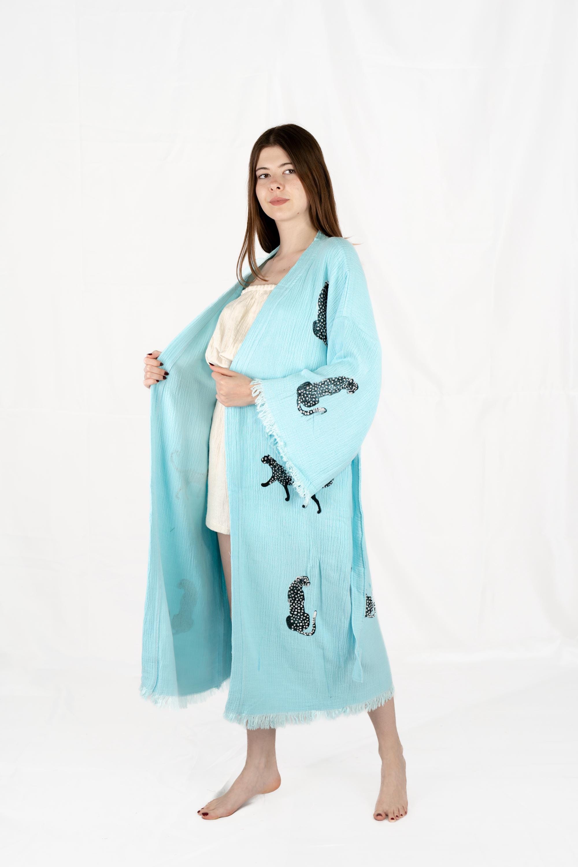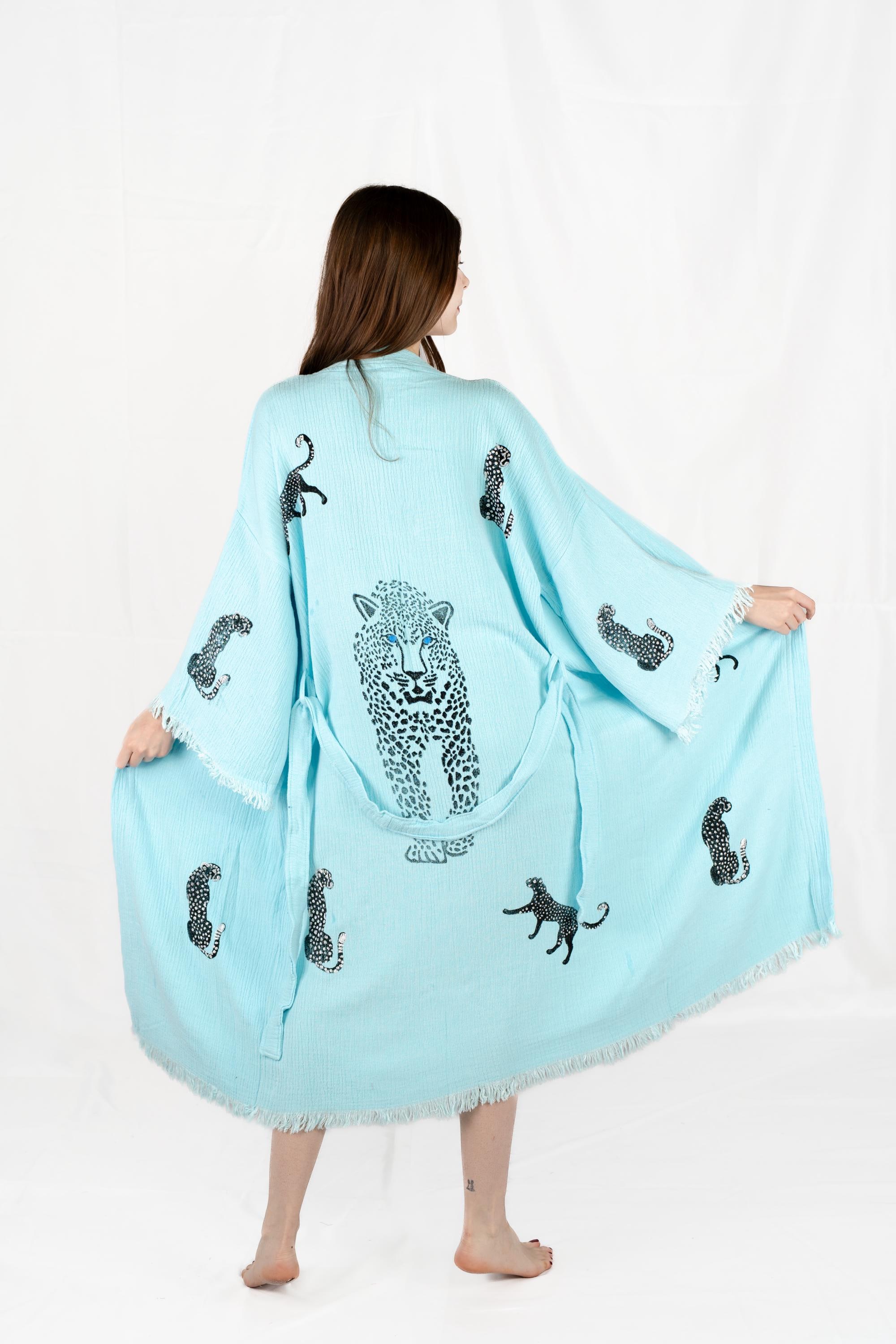 Blue Leopard Print Robe, Animal Print Clothing, Beach Coverup, Unique Kimono, Tiger Print Bathrobe, Gift For Women and Men
