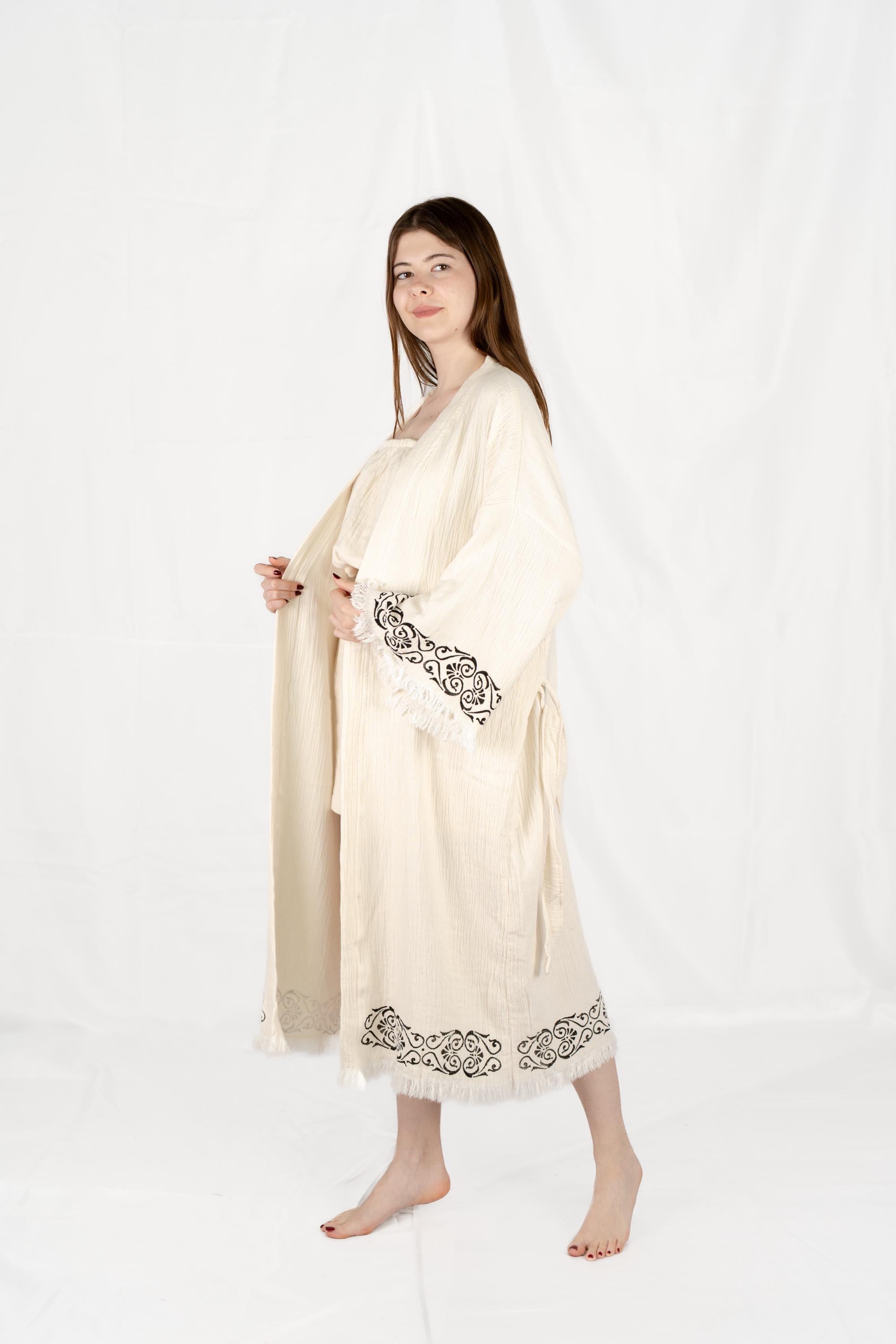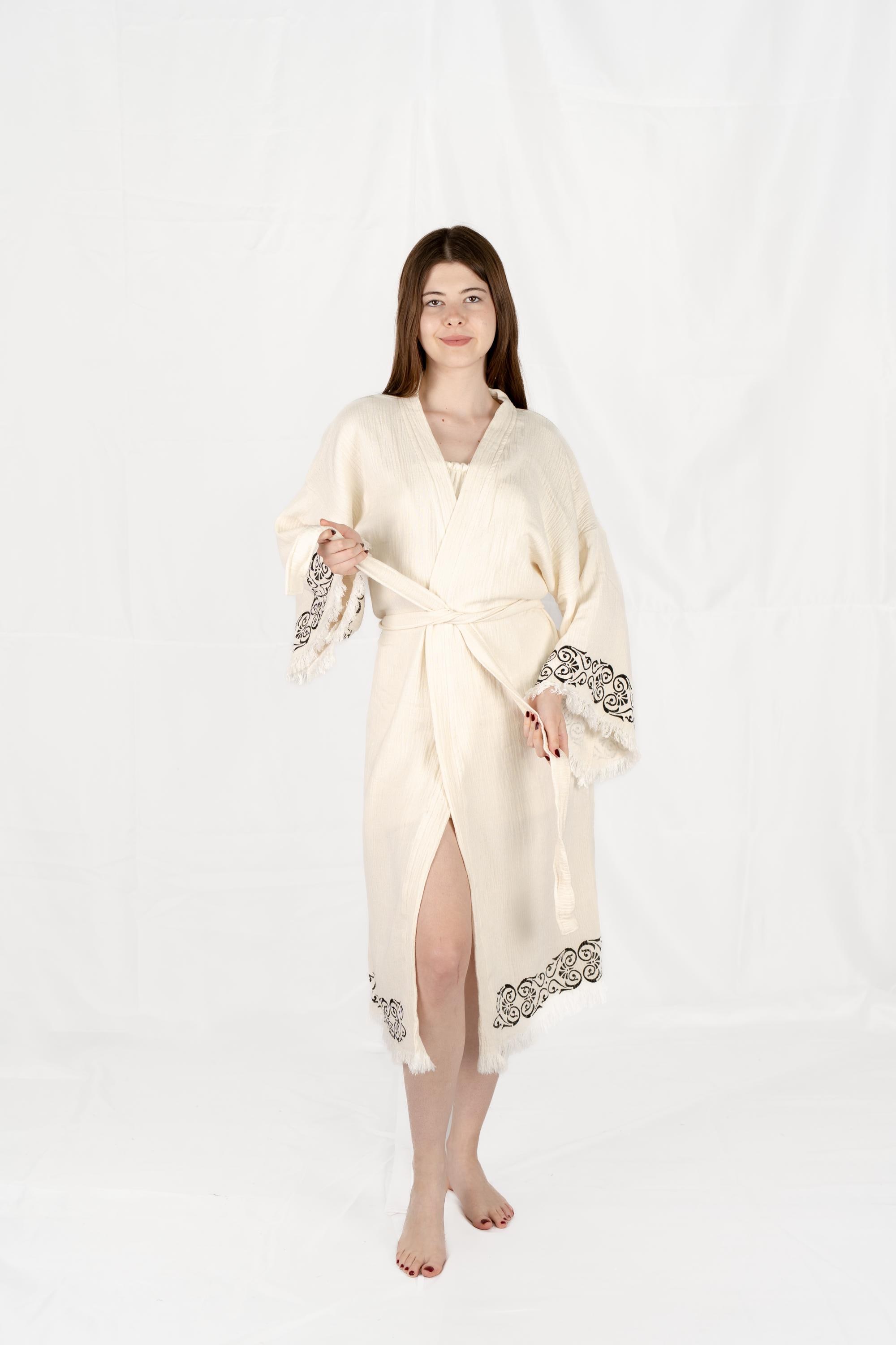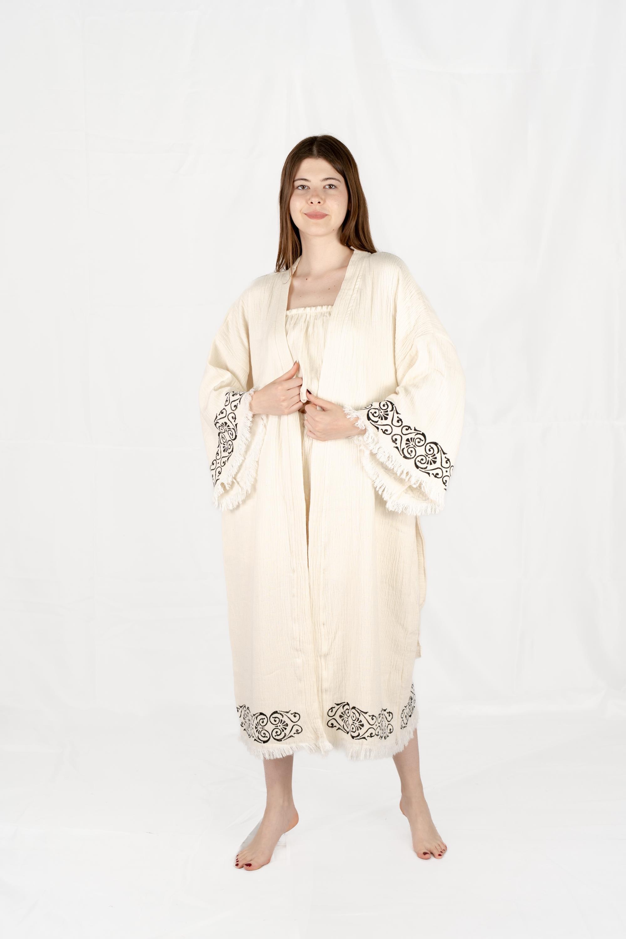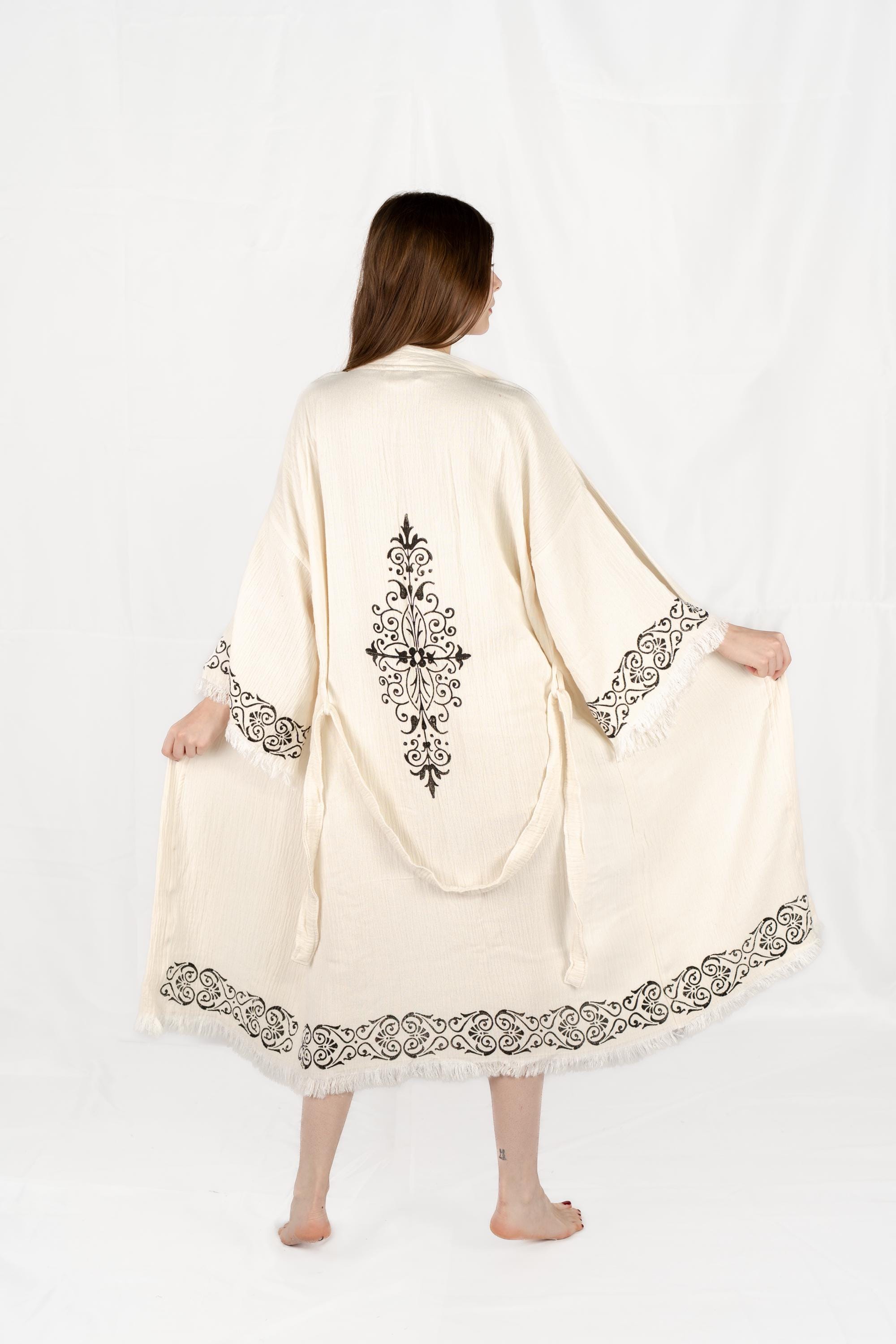 Turkish Organic Cotton Hittite Pattern Muslin Kimono | Authentic Turkish Cotton Robe | White Coverup | Bridesmaid Gifts | Swimsuit Cover