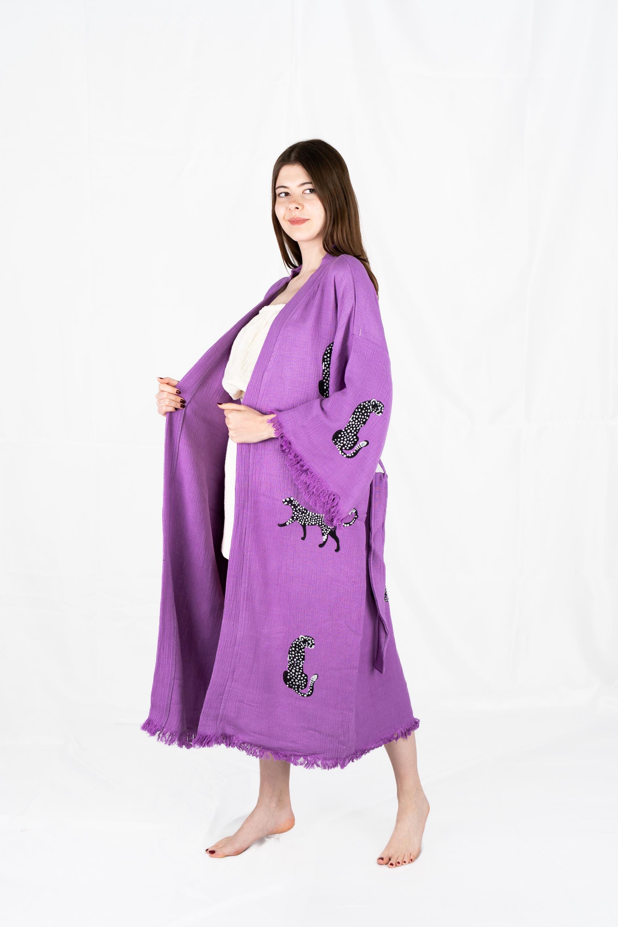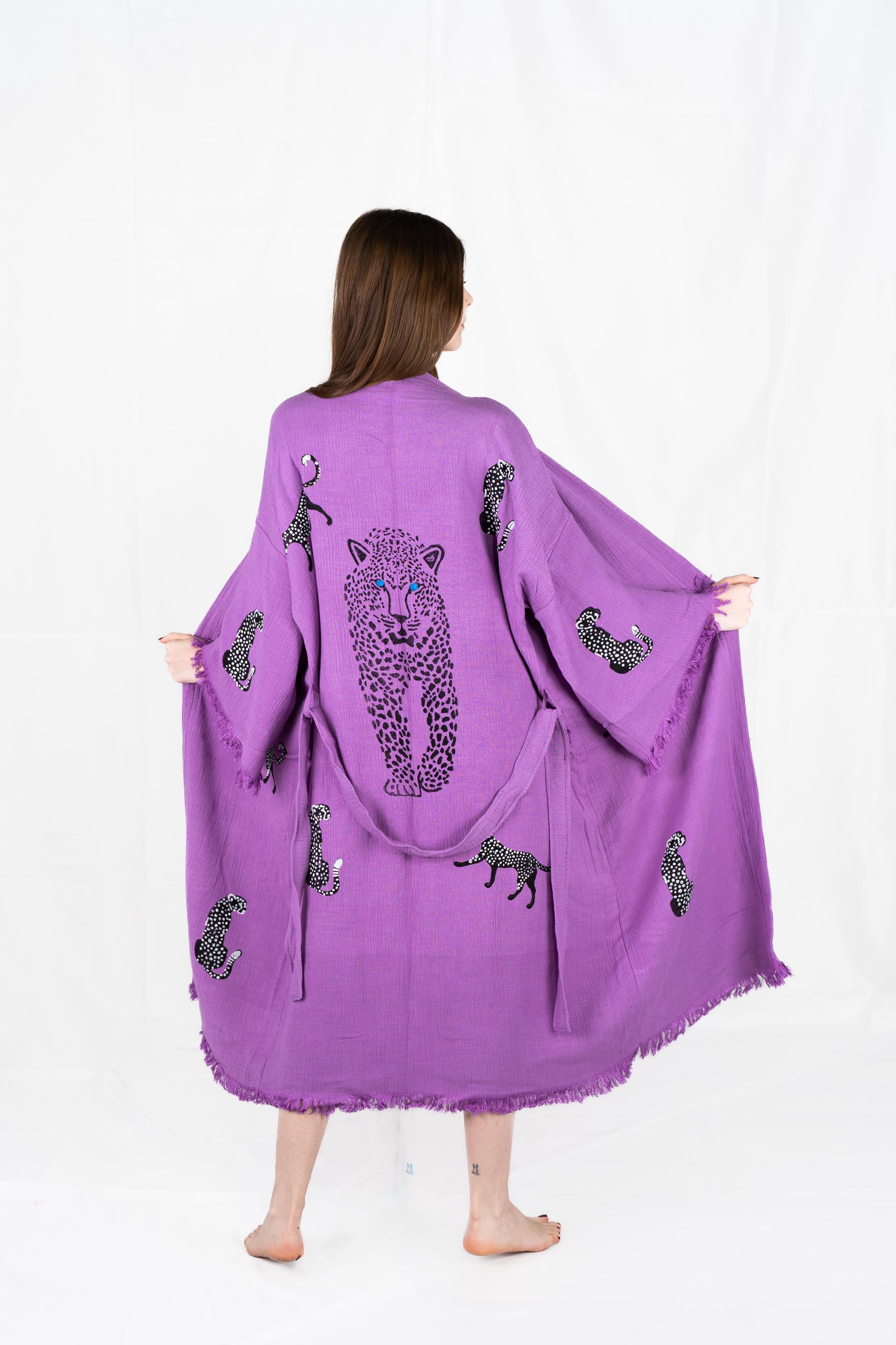 Purple Leopard Print Robe, Animal Print Clothing, Beach Coverup, Unique Kimono, Tiger Print Bathrobe, Gift For Women and Men