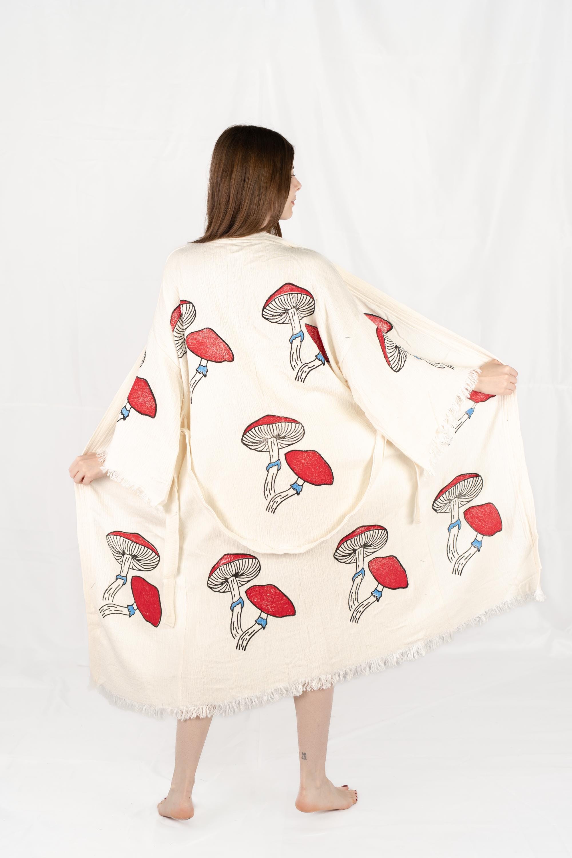Mushroom Kimono Robe | Boho Cottagecore Kimono | Red Mushroom Print Duster | Long Gauze Kimono | Festival Cover Up | Cottage core Robe