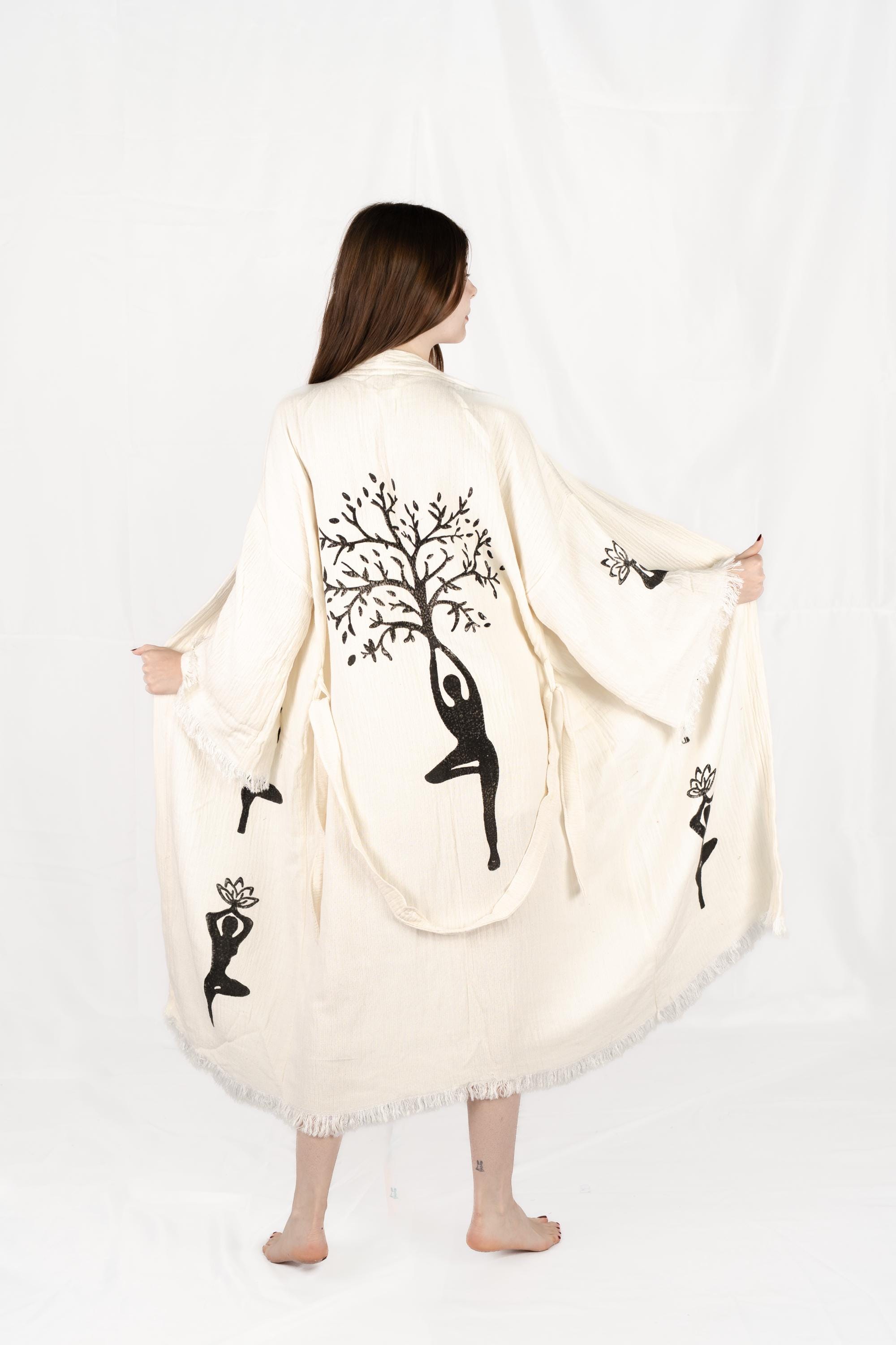 White Kimono Robe with Unique Tree & Indian Design Printed, Gift For Her, Cozy Christmas Robe