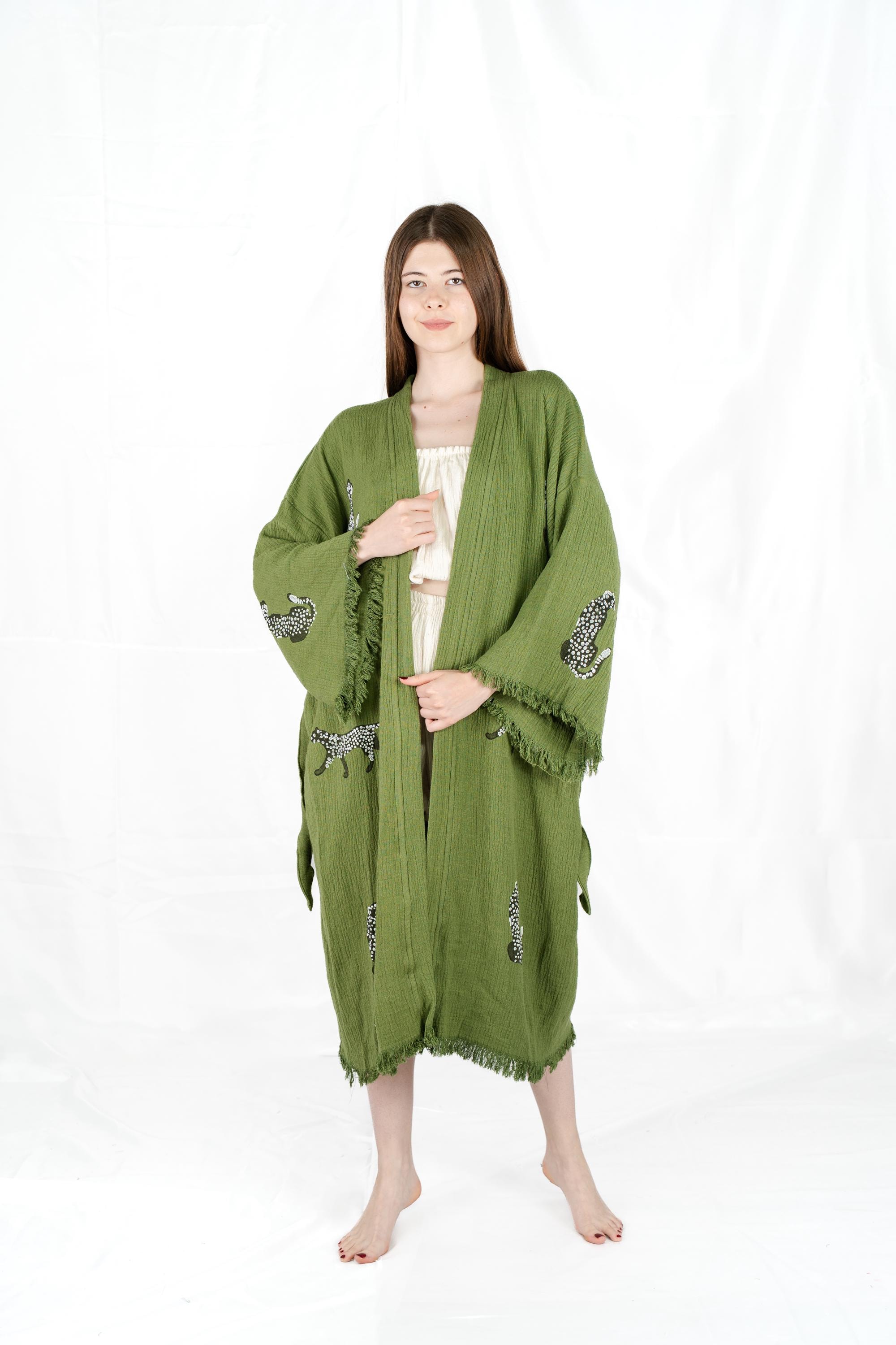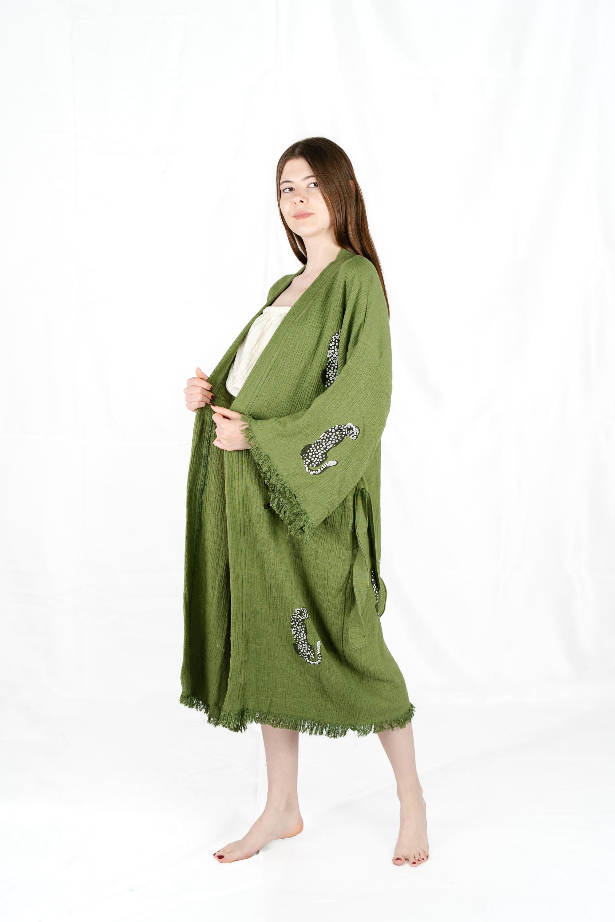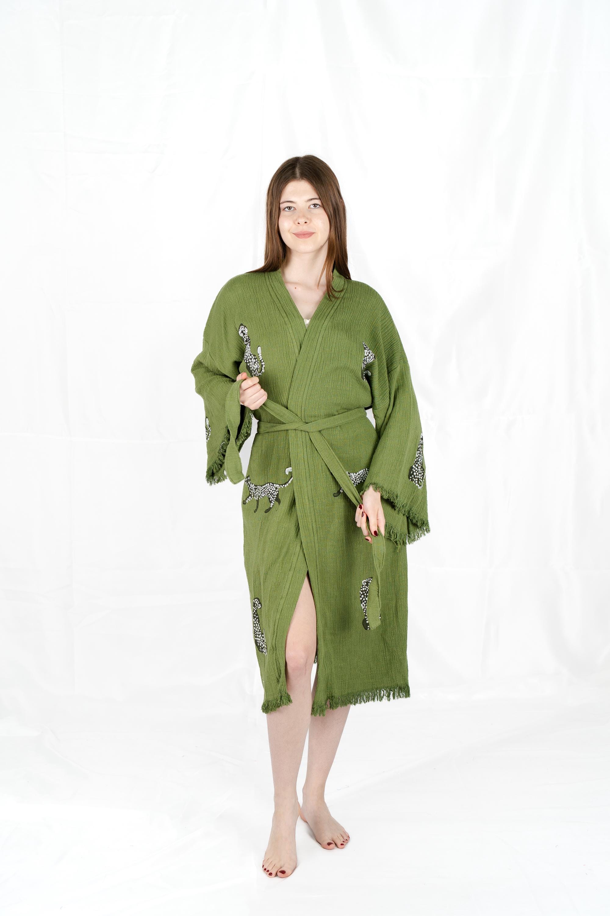 Green Leopard Print Robe, Animal Print Clothing, Beach Coverup, Unique Kimono, Tiger Print Bathrobe, Gift For Women and Men